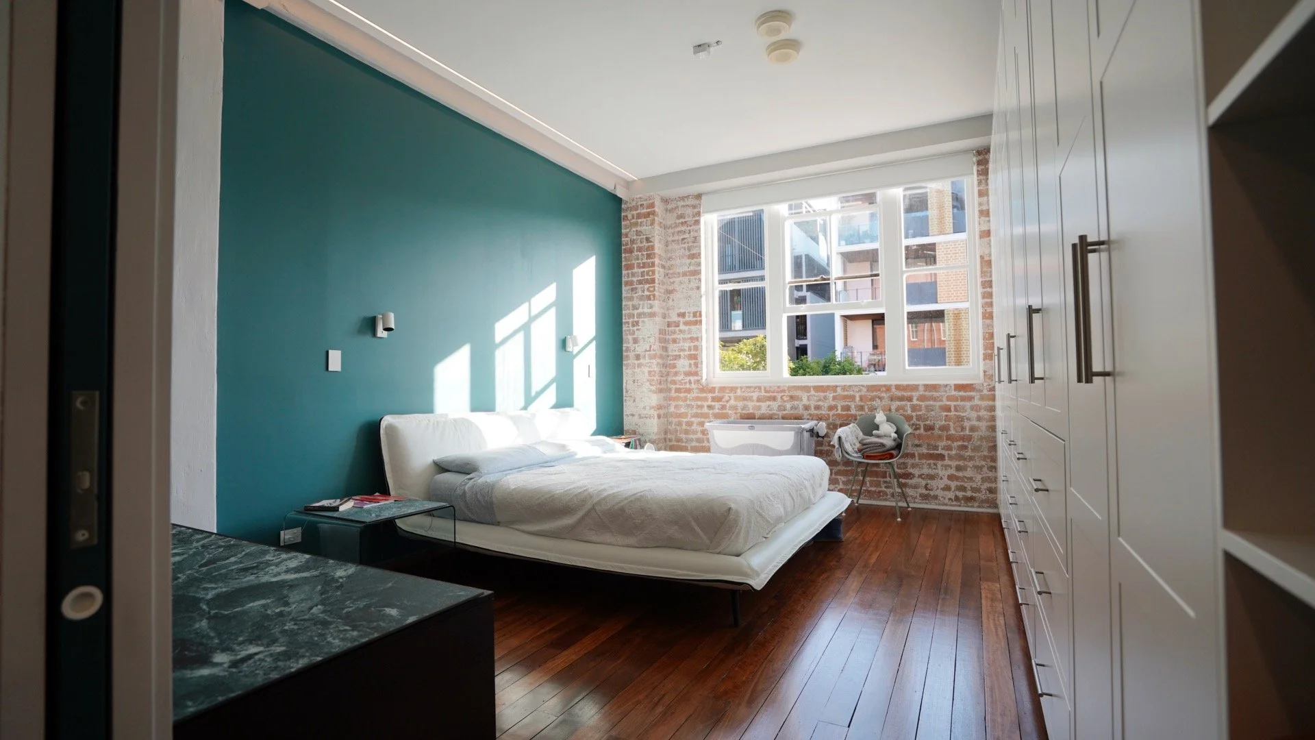TONIC undertook the renovation of an apartment in the iconic and heritage listed Winchcombe Carson Woolstores in Teneriffe. The original brick walls, timber floors, solid timber columns and beams are left exposed as references to the building’s industrial origins. The clients wanted to refresh the kitchen and bathrooms, lighten up the deep apartment plan, and utilize the high ceilings to create smart storage and an open and inviting living space that maximalizes the functional space available, while also making the space appear large and full of light.